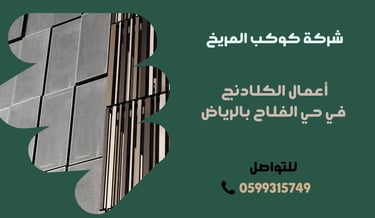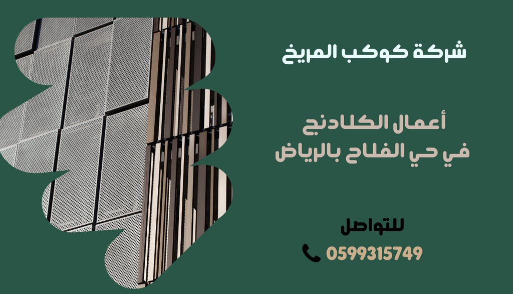 إذا كنت تبحث عن تصنيع وتركيب الكلادنج في حي الفلاح بالرياض أو أي حي آخر في الرياض، فنحن في شركة حديد والمنيوم ومظلات الرياض نقدم لك الحلول المثالية. نعمل على تحسين مظهر المباني وتحقيق الأداء الأمثل من خلال المواد التي نستخدمها، والتي توفر لك مزايا متعددة مثل:
