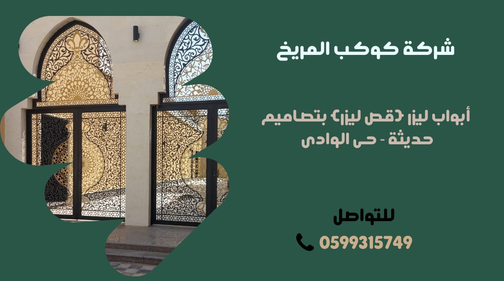 شركة حديد والمنيوم ومظلات الرياض، الواقعة في حي الوادي بالرياض، تقدم خدمات متميزة في مجال قص الليزر. تستعرض الشركة تصاميم حديثة تلبي احتياجات العملاء بأسلوب فريد يجمع بين الابتكار والجودة. توفر أبواب ليزر مصممة بدقة، مما يمنح كل مساحة لمسة جمالية وعصرية. تتميز هذه الأبواب بأنها تعكس روعة التصميم وتسمح بالتخصيص وفقاً لرغبات العملاء. يسعد فريق شركة حديد والمنيوم ومظلات الرياض بالمساعدة في تحويل أفكارك إلى واقع، حيث يمكن الاتصال بهم على الرقم 0599315749 لمزيد من المعلومات أو الاستفسارات. بجودة خدماتهم واهتمامهم بالتفاصيل، تأكد أنك ستحصل على منتجات تفوق توقعاتك.