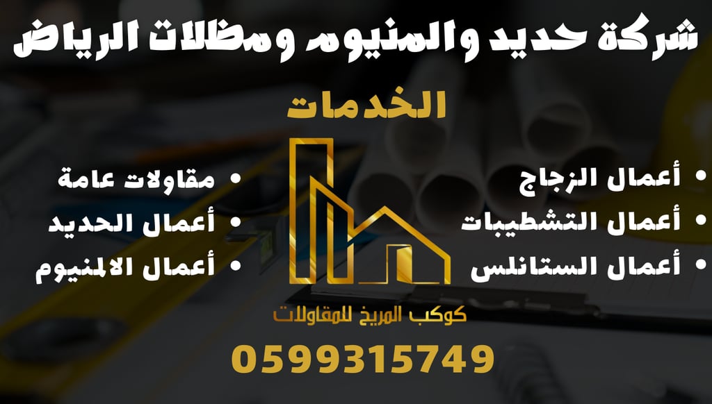 شركة حديد والمنيوم ومظلات الرياض هي واحدة من الشركات الرائدة في مجال المقاولات في مدينة الرياض. تتميز الشركة بتقديم مجموعة متنوعة من الخدمات الإنشائية والتصميمية، حيث تسعى جاهدة لتلبية احتياجات عملائها وتجاوز توقعاتهم. مع فريق من المهندسين والفنيين ذوي الخبرة، تضمن الشركة تنفيذ المشاريع بجودة عالية وفي الوقت المحدد. كما تتمتع الشركة بسمعة طيبة في السوق السعودي بفضل التزامها بالمهنية والشفافية. يمكنك التواصل مع شركة حديد والمنيوم ومظلات الرياض عبر الهاتف على الرقم 0599315749 للحصول على المزيد من المعلومات حول خدماتها ومشاريعها الحالية.