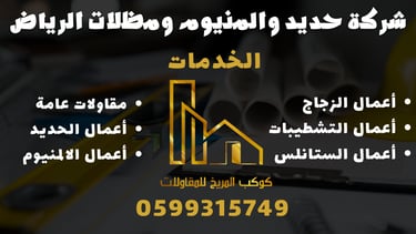 مرحبًا بكم في شركة حديد والمنيوم ومظلات الرياض، الشركة الرائدة في خدمات المقاولات العامة في الرياض، حيث نضع الجودة والاحترافية في صميم كل مشروع. نقدم أعمال الحديد، الألمنيوم، الستانلس ستيل، الزجاج، التشطيبات، المظلات، الهنجرات، السواتر والكلادنج بأعلى معايير التنفيذ وباستخدام أجود المواد.